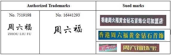The two defendants in the original trial (Zhongbai Jewelry Store and Chendai Town Zhou Liu Fu Jewelry Store) used the above sued marks on the background walls, store signs, jewelry counters, jewelry boxes, billboards, packaging bags, quality assurance certificates and other places in their stores and made the following defense: firstly, this was a reasonable use of the franchisor's business name rather than trademark; secondly, the franchisor enjoyed the right of prior use. The first instance judgment determined that " "(Zhou Liu Fu), " "(Zhou Liu Fu Jewelry) and other sued infringing marks which prominently used "周六福"(Zhou Liu Fu) constituted trademark infringement, while the mark "香港周六福黃金鉆石首飾公司加盟店"(Hong Kong Zhou Liu Fu Gold Diamond Jewelry Company Franchised Store) that did not prominently use "周六福"(Zhou Liu Fu) constituted unfair competition. The two defendants in the original trial appealed, and the second instance judgment revoked the determination of unfair competition in the first instance judgment, on the grounds that the two defendants lacked subjective bad faith, and that no evidence proved that their marks were "confusing and misleading enough to the relevant public", and thus did not constitute unfair competition. After the retrial request made by Zhou Liu Fu Jewelry Co., Ltd. ("Zhou Liu Fu Jewelry"), Fujian Provincial Higher People's Court determined as follows in the (2021) Min Min Zai No. 250 and (2021) Min Min Zai No. 253 civil judgments: (1) the trademarks " " and " "(Zhou Liu Fu) have possessed relatively high reputation and the two defendants in the original trial, as peer competitors, should reasonably avoid these trademarks; (2) "周六福"(Zhou Liu Fu) is the most recognizable and distinctive part in the sued infringing mark " ". The trade name of this Hong Kong company is exactly the same with the word part in the registered trademark of the right owner. In the case that the business scopes of both parties overlap, such using manner is sufficient to cause confusion and misunderstanding and thus constitutes unfair competition; (3) the two defendants in the original trial have no right to defend by using a subsequently obtained business authorization to claim for prior use; (4) the copyright registration date provided by the two defendants in the original trial as evidence is later than the application date of the right owner's registered trademark, which cannot prove the prior copyright; and (5) according to the judicial spirit of the Supreme Court, if enterprises registered abroad carry out business activities in the mainland, they must abide by the domestic laws and reasonably avoid the prior rights that have been protected by the domestic laws when using business marks such as the foreign name of enterprises. Therefore, the two defendants in the original trial cannot be exempted from infringement liability, but after assuming the infringement liability, they can claim rights from the franchisor based on the contract.