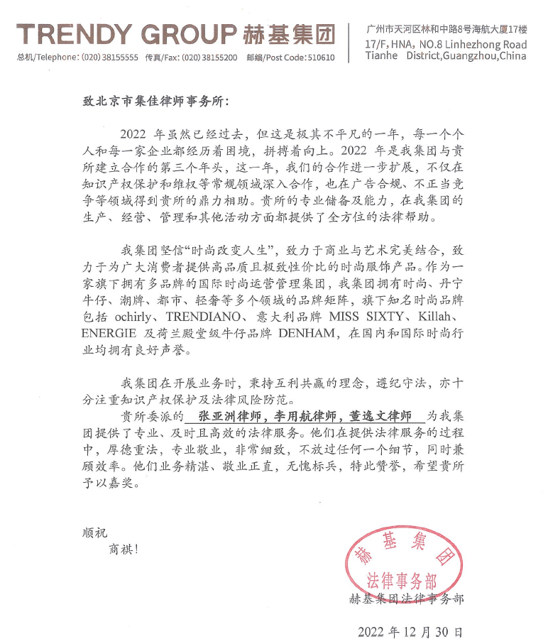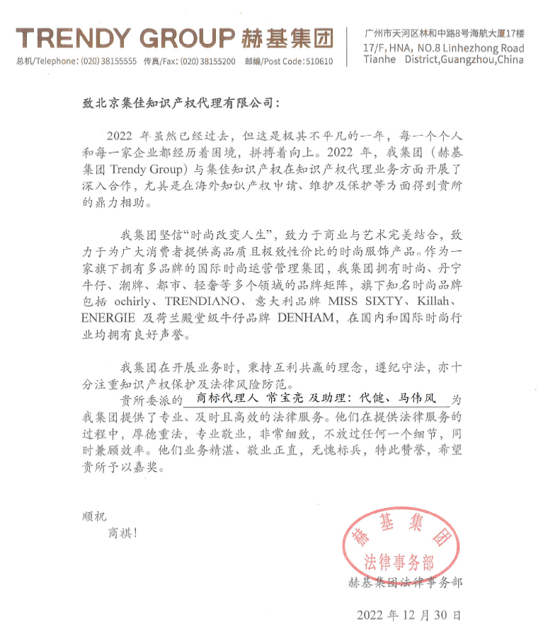 新年早々、集佳は顧客の赫基集団から心溫まる稱賛の書簡(jiǎn)を受領(lǐng)した。書簡(jiǎn)では、知財(cái)保護(hù)と権利保護(hù)、広告コンプライアンス、不正競(jìng)爭(zhēng)等の分野における集佳の優(yōu)れたサービスと確かな業(yè)務(wù)が高く認(rèn)められ、また張亜洲、李用航、董逸文、常寶亮、代健、馬偉風(fēng)らの専門スタッフの真面目で責(zé)任感あふれる仕事ぶりが高く評(píng)価され、法務(wù)サービスを提供する中での彼らの人徳の高さや法律重視の姿勢(shì)、専門性、効率の良さ、勤勉さ、誠(chéng)実さを稱賛し、模範(fàn)労働者の名に恥じないと讃えている。