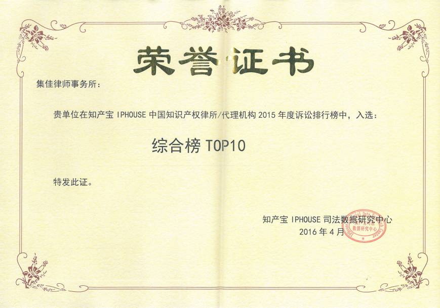 2016年5月11日下午, 知產(chǎn)寶司法數(shù)據(jù)研究座談會(huì)暨知產(chǎn)寶中國(guó)知識(shí)產(chǎn)權(quán)律所訴訟排行榜優(yōu)秀律所頒獎(jiǎng)儀式在京舉行,集佳律所憑借自身的專(zhuān)業(yè)實(shí)力和卓越的影響力入選行政榜TOP10和綜合榜TOP10。各級(jí)司法機(jī)關(guān)代表、相關(guān)國(guó)家駐華使館人員及優(yōu)秀的律所、代理公司代表等五十余人參加了此次頒獎(jiǎng)儀式。