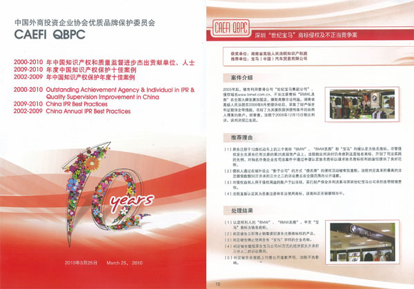 2010年3月25日,在隆重的中國外商投資企業(yè)協(xié)會優(yōu)質品牌保護委員會成立十周年慶典上,由集佳代理的寶馬股份公司訴深圳市世紀寶馬服飾有限公司(以下簡稱“世紀寶馬”)等商標侵權及不正當競爭一案榮登品保委2009-2010年度中國知識產權保護十佳案例。