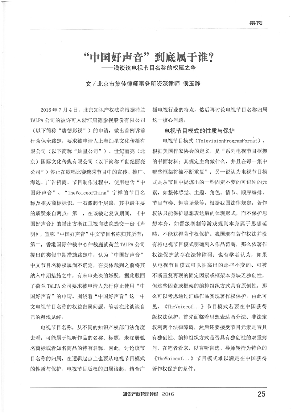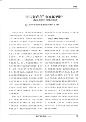 集佳資深律師侯玉靜文章《“中國好聲音”到底屬于誰?——淺談該電視節目名稱的權屬之爭》在《知識產權管理評論》發表