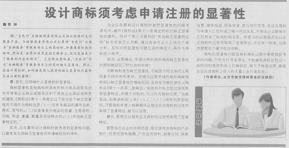 集佳代理人撰文《設計商標須考慮申請注冊的顯著性》在《中國貿易報》發表