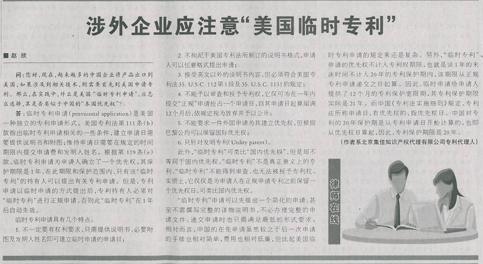 集佳代理人撰文《涉外企業應注意“美國臨時專利”》在《中國貿易報》發表