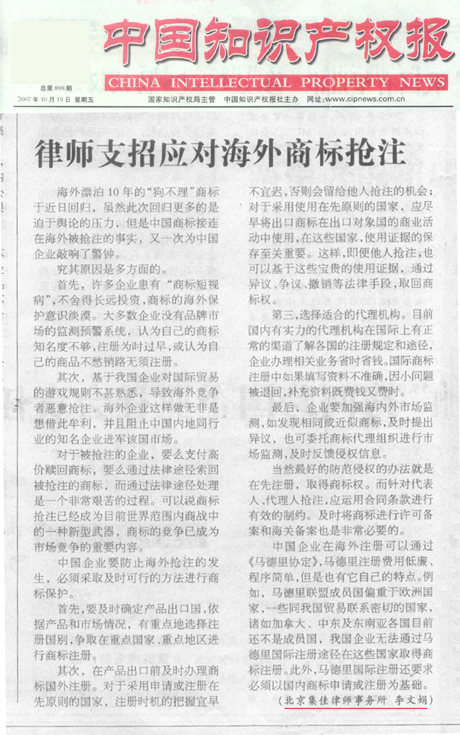 《中國知識產權報》:律師支招應對海外商標搶注