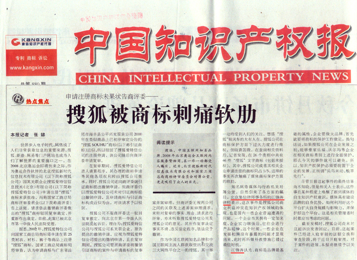 《中國知識產權報》、《千龍網》:集佳律師就“搜狐商標被搶注”事件接受采訪