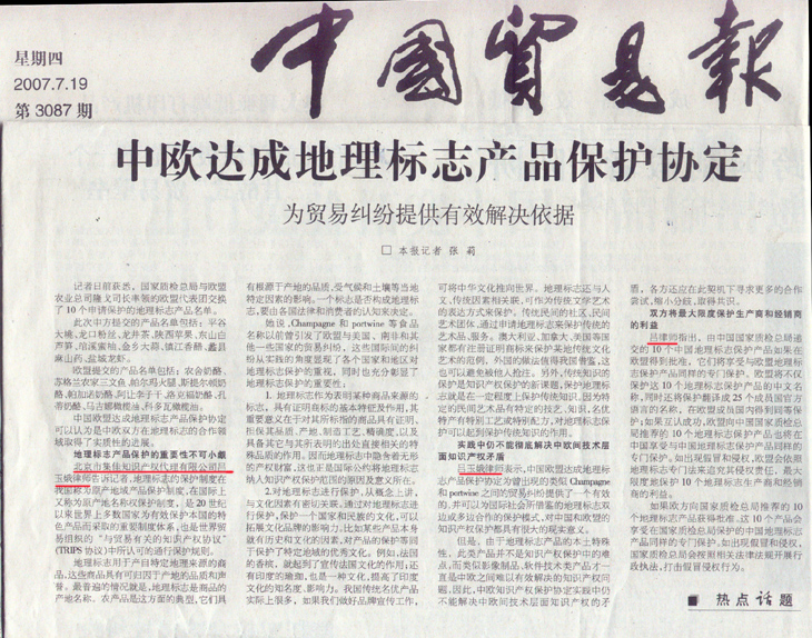 原文:《中歐達成地理標志產品保護協定 為貿易糾紛提供有效解決依據 》