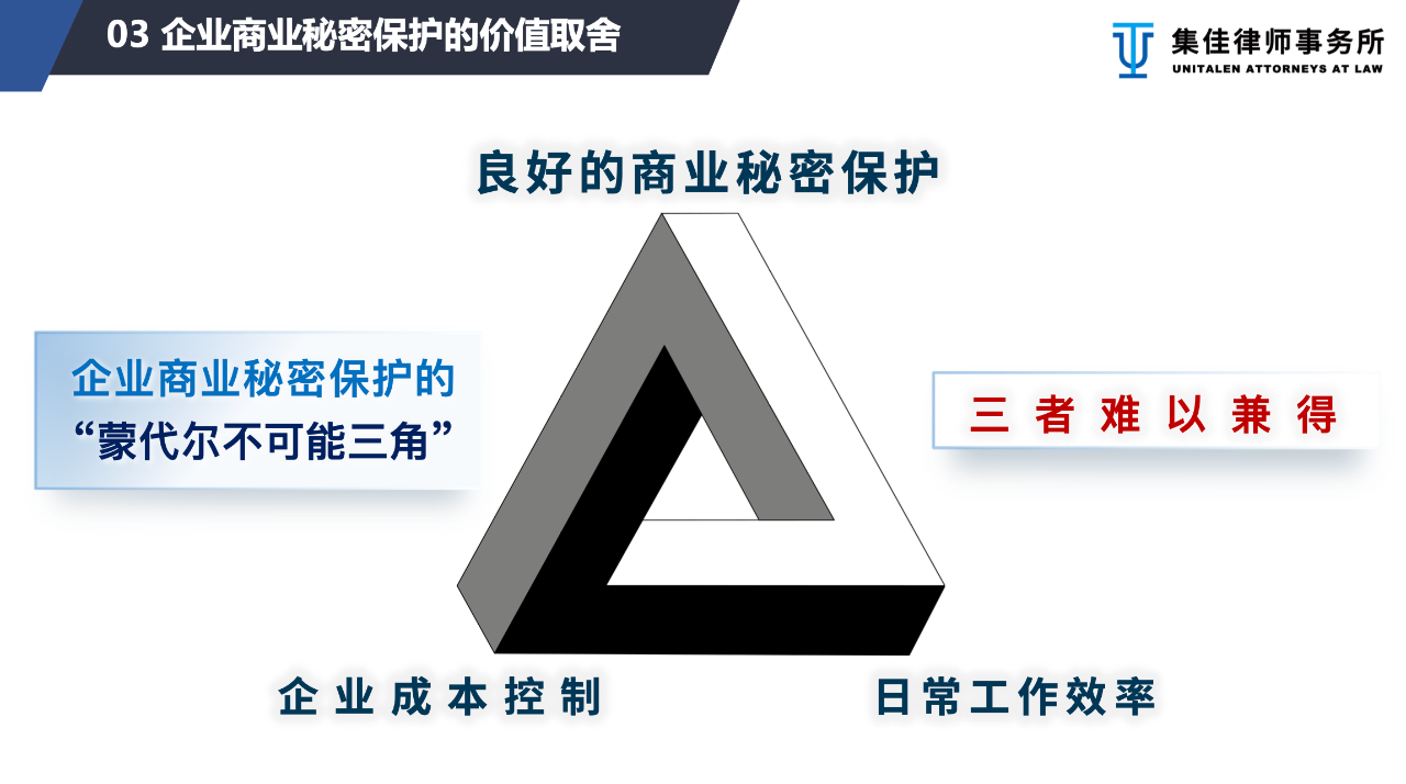 蒙代爾不可能三角又稱三元悖論,通常應(yīng)用于宏觀經(jīng)濟(jì)學(xué),其本質(zhì)是指基于特定的情形下,三種不同位面的價(jià)值難以同時(shí)實(shí)現(xiàn),最多只能同時(shí)滿足兩個(gè)目標(biāo),而放棄另外一個(gè)目標(biāo)。【19】在企業(yè)商業(yè)秘密保護(hù)中,同樣會(huì)面臨著三元悖論的局面,即“良好的商業(yè)秘密保護(hù)”,“企業(yè)成本控制”及“日常工作效率”三者之間難以兼得。例如,在基于優(yōu)先保護(hù)企業(yè)商業(yè)秘密,同時(shí)兼顧企業(yè)成本的基礎(chǔ)之下所采取的保密措施,對(duì)企業(yè)日常運(yùn)營(yíng)的工作效率必然會(huì)有一定程度的影響。企業(yè)所采取常見的措施包括限制個(gè)人電腦的使用、禁用通訊軟件及設(shè)備的使用、涉密材料的接觸及借閱等需多級(jí)審批、員工離職調(diào)崗的脫密流程等。而為實(shí)現(xiàn)相同等級(jí)商密保護(hù)的基礎(chǔ)之下,降低運(yùn)營(yíng)行政成本提升工作效率,則勢(shì)必需要應(yīng)用技術(shù)監(jiān)管手段及管理體系,比如信息安全設(shè)備及配套軟件,防數(shù)據(jù)泄漏軟件,區(qū)域監(jiān)控設(shè)備等,這無疑亦會(huì)增加企業(yè)運(yùn)營(yíng)成本。