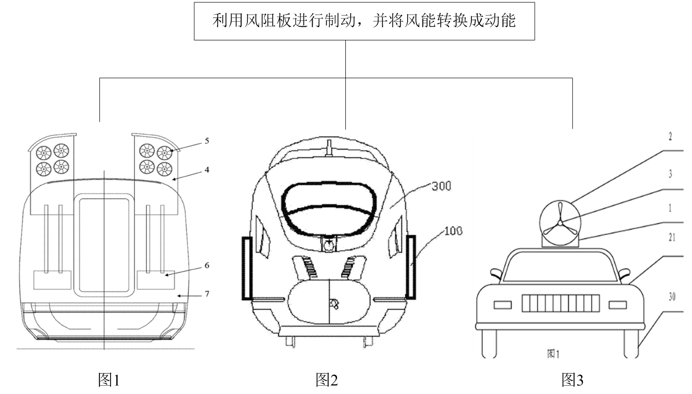 構(gòu)件檢索式(TI=(風(fēng)阻制動)) AND (IPC=((B61 OR B60)))在DOCDB、CNIPR就檢索到9件與該發(fā)明構(gòu)思相同的專利,但是具體的實(shí)現(xiàn)方式不同,例如專利CN202944357U保護(hù)的技術(shù)方案如圖2所示,具體的“風(fēng)阻制動裝置,包括風(fēng)阻制動板和驅(qū)動機(jī)構(gòu),驅(qū)動機(jī)構(gòu)包括驅(qū)動桿,驅(qū)動桿鉸接于風(fēng)阻制動板,風(fēng)阻制動板的一端交接于固定座,并由驅(qū)動桿驅(qū)動而可繞固定座轉(zhuǎn)動”。專利WO2012003631A1權(quán)利要求1保護(hù)的技術(shù)方案如圖3所示,具體的“包括車體、安裝在車體上的蓄電池、和右蓄電池提供電能的電動裝置、與蓄電池電連接的涵道風(fēng)力發(fā)電裝置,隨車輛的快速行駛產(chǎn)生合流風(fēng)進(jìn)行風(fēng)力發(fā)電,并將電能儲存在蓄電池內(nèi)”。