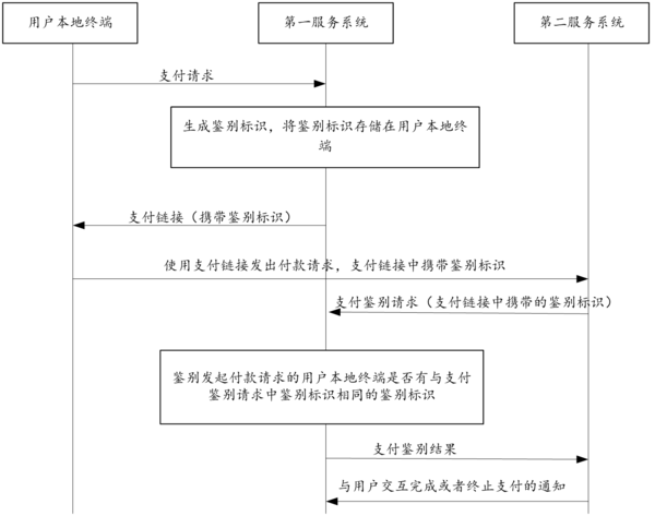 第一服務系統(tǒng)鑒別發(fā)起所述付款請求的用戶本地終端中是否有與支付鑒別請求中攜帶的鑒別標識相同的鑒別標識,并向所述第二服務系統(tǒng)返回支付鑒別結(jié)果;