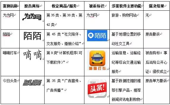 2014年8月上海市第一中級人民法院受理的上海易飾嘉網絡科技有限公司起訴上海沃商信息科技有限公司推出、蘋果APP Store分發的“為為網”APP侵害其第35類、38類、42類服務上注冊的“為為網”商標,索賠人民幣1億元,被業內稱為首例(實際上,立案時間晚于杭州中院“嘀嘀打車”一案)移動互聯網商標侵權糾紛,由于雙方和解或其他原因,該案并未有判決做出。同樣,2014-2015年間,杭州陌陌婚慶服務有限公司以其在45類“社交陪伴、交友服務、婚姻介紹”等服務上注冊的“陌陌”商標,先后向北京市朝陽區人民法院、北京知識產權法院起訴北京陌陌科技有限公司停止“陌陌”軟件的下載服務并索賠1100萬元,后兩案均以原告撤訴結案。2014年5月,杭州妙影微電子有限公司、寧波市科技園區妙影電子有限公司訴北京小桔科技有限公司“嘀嘀打車”侵犯其第9類“計算機程序(可下載軟件)”上注冊的“嘀嘀”商標,索賠經濟損失人民幣8000萬,2015年5月杭州市中級人民法院開庭審理了此案,2016年5月原告以適當價格(據傳為人民幣300萬元)將其注冊商標一并轉讓給被告后,原告撤訴。2016年6月北京博天恒業廣告有限公司向北京市西城區人民法院起訴稱,北京字節跳動科技有限公司、北京字節跳動網絡技術有限公司手機端“今日頭條”APP的名稱、圖標以及PC端“頭條網站”侵犯其在第35類“廣告宣傳、廣告傳播”上核準注冊的“頭條”商標,要求停止侵權、消除影響,并索賠高達人民幣1億元的經濟損失,2016年11月,原告單方撤訴[2]。目前,涉及APP的商標侵權糾紛案件,可資借鑒的判例主要有2014年1月東莞市中級人民法院審理的“115網盤”一案[3],2015年2月北京市海淀區人民法院審理的“滴滴打車”一案[4],2015年12月北京知識產權法院審理的“西柚”一案[5],2016年8月北京市海淀區人民法院審理的“楚楚街”一案[6],2016年9月北京市高級人民法院再審結案的“新浪拍客”一案[7],2017年4月杭州濱江區法院一審的“曹操專車”一案;而杭州中院雖未就“嘀嘀打車”一案做出判決,但主審法官在其文章中[8]公開了該案的審理思路,同樣具有重要的參考價值。