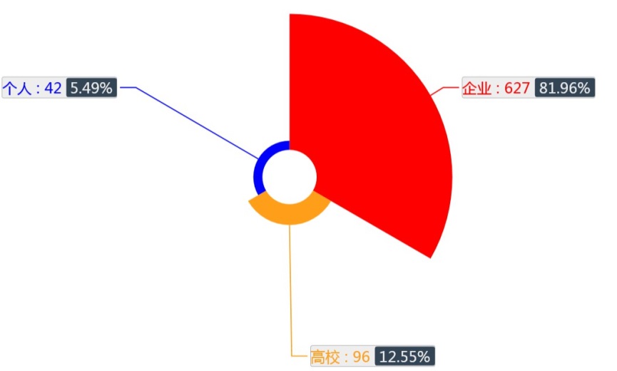 本屆專利獎獲獎專利中,企業(yè)專利627件,占比81.90%,高校專利96件,占比12.55%,個人專利42件,占比僅5.49%