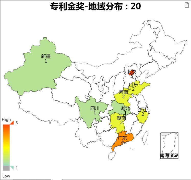 其中,廣東省遙遙領(lǐng)先,廣東一省占比超過了獲獎專利總量的1/5。