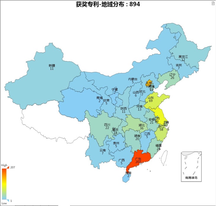 894件獲獎專利中,東部沿海地區(qū)的山東(69件)、江蘇(89件)、上海(42件)、浙江(58件)、福建(24)件、廣東(207件)占據(jù)了獲獎專利總量的一半以上。