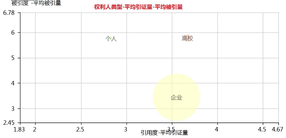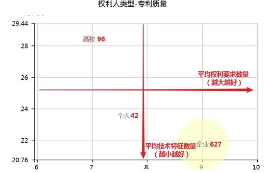下圖為企業(yè)、高校、個人三種不同類型的權(quán)利人的專利質(zhì)量氣泡。橫坐標(biāo)為平均權(quán)利要求數(shù)量,縱坐標(biāo)為平均技術(shù)特征數(shù)量,氣泡大小為獲獎專利數(shù)量。