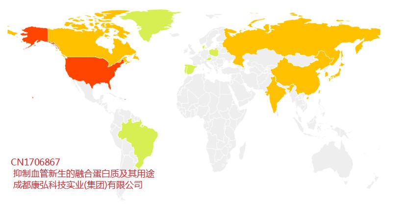 在獲獎專利中,同族數(shù)量排名第一的是成都康弘科技實業(yè)(集團)有限公司的【CN1706867-抑制血管新生的融合蛋白質(zhì)及其用途】,該專利不僅經(jīng)歷過無效考研,還擁有多達(dá)25個專利族,在14個國家獲得了授權(quán)。