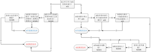 下圖示出了一種判斷對(duì)比文件D是否是專(zhuān)利申請(qǐng)A的現(xiàn)有技術(shù)的方法。