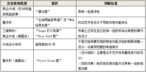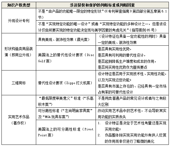表1 不同類型知識產(chǎn)權(quán)關(guān)于“非功能性”的判斷標(biāo)準(zhǔn)或因素
