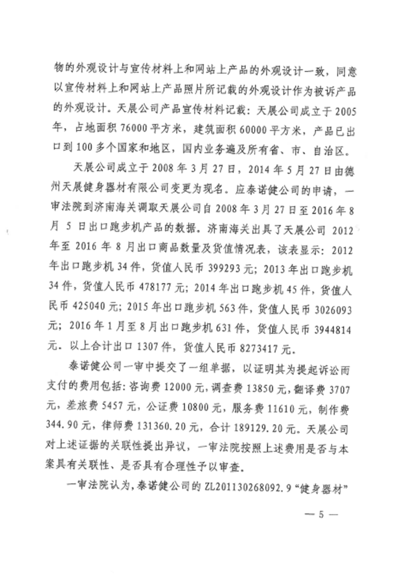集佳代理意大利泰諾健公司訴山東天展健身器材有限公司(以下簡稱“天展公司”)侵害外觀設計專利權糾紛一案,經濟南中院一審((2016)魯民初1656號)、山東高院二審((2017)魯民終797號),我們已于近日收到由山東高院做出的終審判決。山東高院駁回被告上訴,維持一審判決,認定被告天展公司生產、銷售、許諾銷售的被控侵權跑步機產品落入涉案專利權保護范圍,并支持了原告泰諾健公司主張的停止侵權行為、賠償經濟損失及合理維權費用等請求。