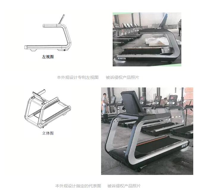 原告經(jīng)調(diào)查發(fā)現(xiàn),被告持有用于制造涉案侵權(quán)產(chǎn)品TZ-7000跑步機(jī)的專用設(shè)備、模具,并在其工廠內(nèi)大量制造、組裝、存儲(chǔ)TZ-7000跑步機(jī)產(chǎn)品,并通過(guò)互聯(lián)網(wǎng)大量銷售及許諾銷售上述侵權(quán)產(chǎn)品。鑒于此,原告泰諾健公司于2016年7月將被告天展公司訴至濟(jì)南中院,請(qǐng)求判令被告停止侵權(quán)行為,即停止制造、許諾銷售、銷售侵犯原告外觀設(shè)計(jì)專利權(quán)的跑步機(jī)產(chǎn)品,并賠償原告實(shí)際損失人民幣100萬(wàn)元及合理維權(quán)費(fèi)用20萬(wàn)元。被控侵權(quán)跑步機(jī)產(chǎn)品與涉案專利的外觀設(shè)計(jì)簡(jiǎn)單比對(duì)可參見(jiàn)下圖: