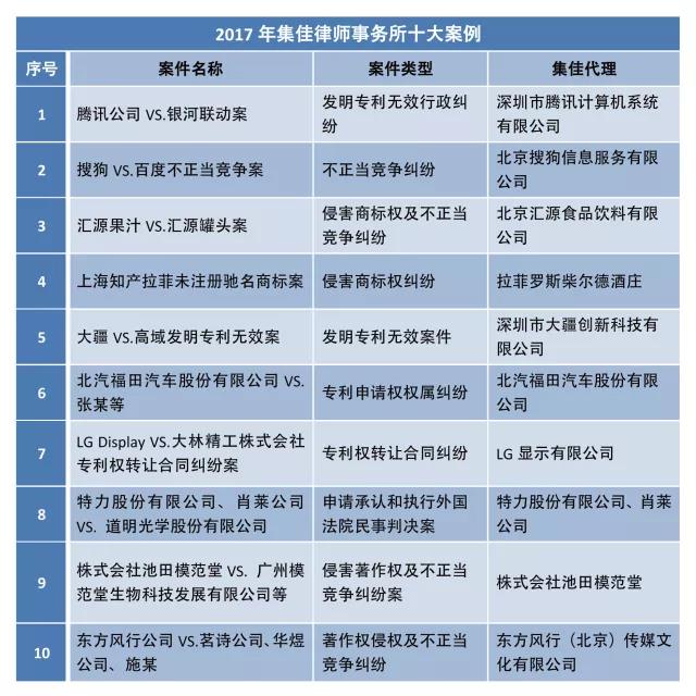集佳代理的入選各地法院十大知識產(chǎn)權(quán)案例的其他典型案件如下: