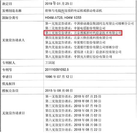 涉案專利名稱為“能夠與電腦相連接的電話機(jī)或移動(dòng)電話機(jī)”,基于該專利,專利權(quán)人王國(guó)起自封“發(fā)漢字和圖像信息的電話機(jī)/移動(dòng)電話機(jī)的全世界首創(chuàng)人”。2018年,王國(guó)起同時(shí)與中國(guó)移動(dòng)、聯(lián)通、電信、搜狐、蘋果、華為、小米、錘子、農(nóng)行、交行等等30余家企業(yè)發(fā)生專利侵權(quán)行政糾紛,涉案金額共計(jì)數(shù)十億元之多。