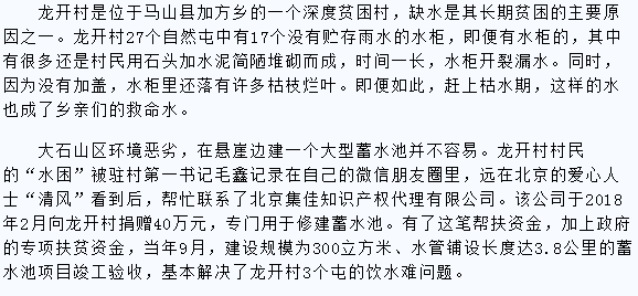 據(jù)了解,龍開(kāi)村是目前南寧市僅剩的10個(gè)因脫貧指標(biāo)未達(dá)標(biāo)而沒(méi)脫貧摘帽的深度貧困村之一。該村山多地薄水少,由于季節(jié)性缺水,飲水困難、飲水衛(wèi)生的問(wèn)題成為影響當(dāng)?shù)卮迕窕旧畹淖钔怀鰡?wèn)題,并深刻制約了當(dāng)?shù)氐慕?jīng)濟(jì)發(fā)展。2018年,北京集佳知識(shí)產(chǎn)權(quán)有限公司了解到這一情況之后,積極幫助龍開(kāi)村出主意想辦法,并捐贈(zèng)40萬(wàn)元,在龍開(kāi)村仲團(tuán)屯修建了蓄水池工程,徹底解決了多年來(lái)長(zhǎng)期困擾三個(gè)屯村民的飲水難問(wèn)題,并改善了農(nóng)業(yè)生產(chǎn)條件,為當(dāng)?shù)卮迕窆?jiān)脫貧提供了信心和希望。2019年5月13日,龍開(kāi)村黨支部第一書(shū)記毛鑫等一行4人代表村民為集佳贈(zèng)送“愛(ài)心傾注龍開(kāi)蓄水池,精準(zhǔn)扶貧深度貧困村”錦旗,表達(dá)了龍開(kāi)村民的真誠(chéng)謝意。