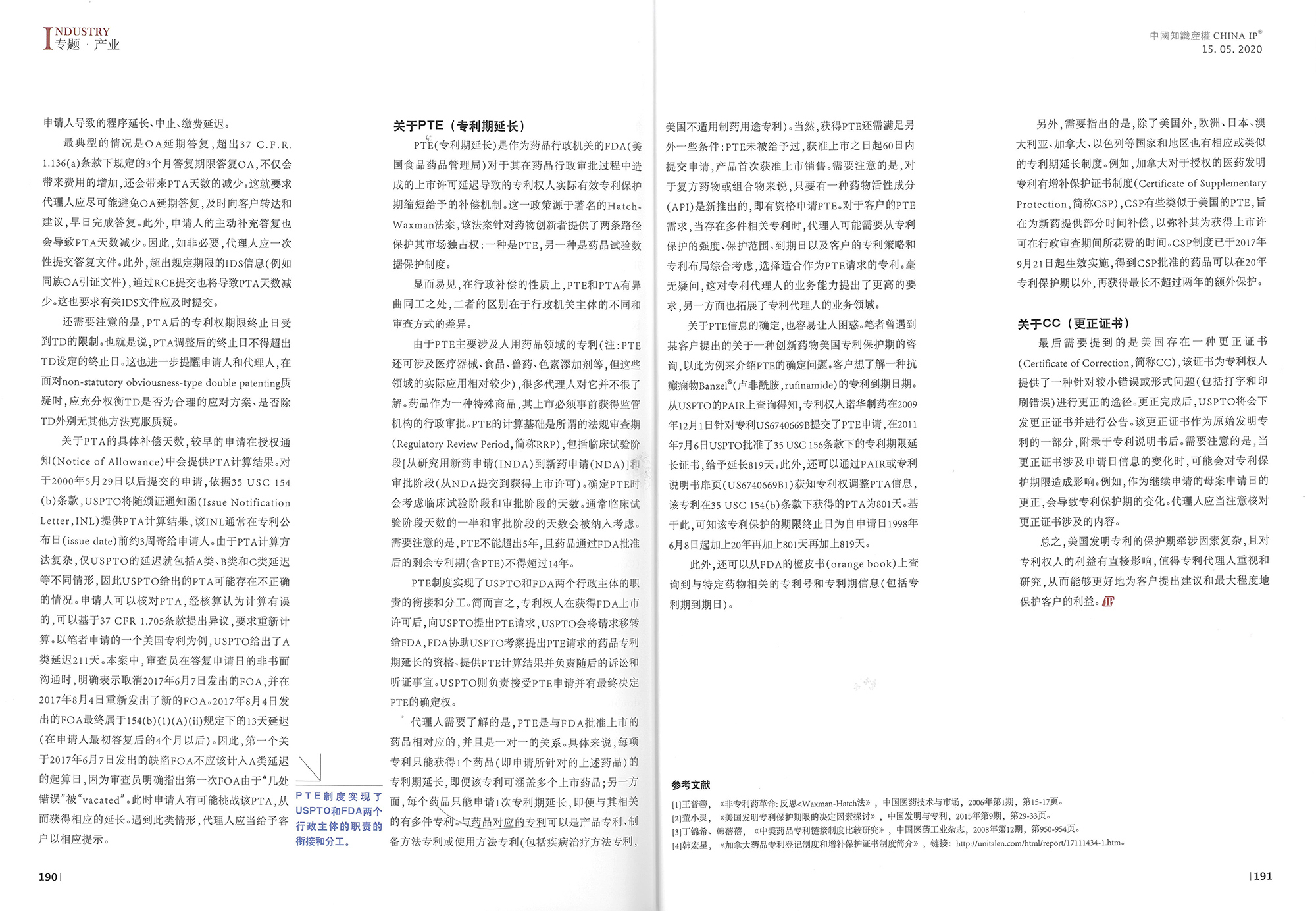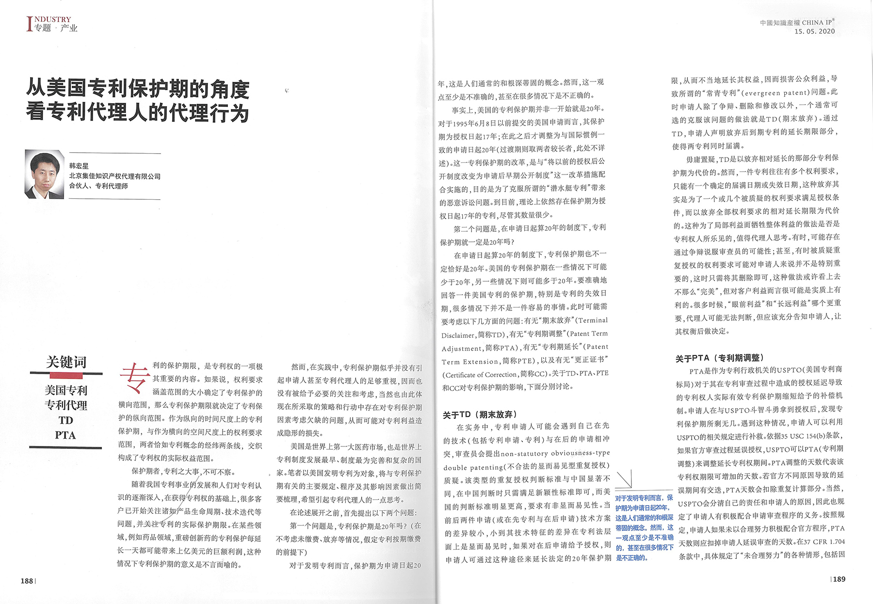 集佳文章《從美國(guó)專利保護(hù)期的角度看專利代理人的代理行為》在《中國(guó)知識(shí)產(chǎn)權(quán)》發(fā)表