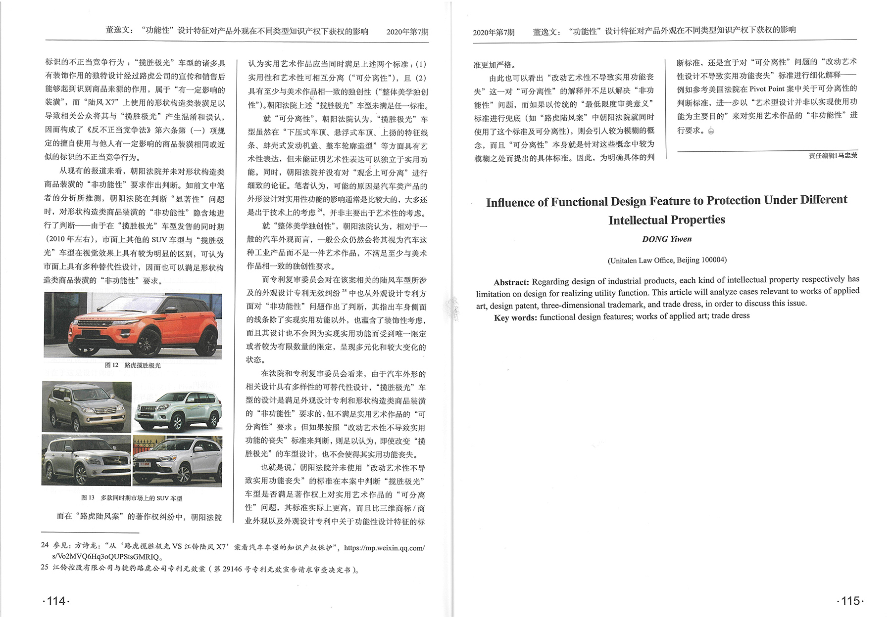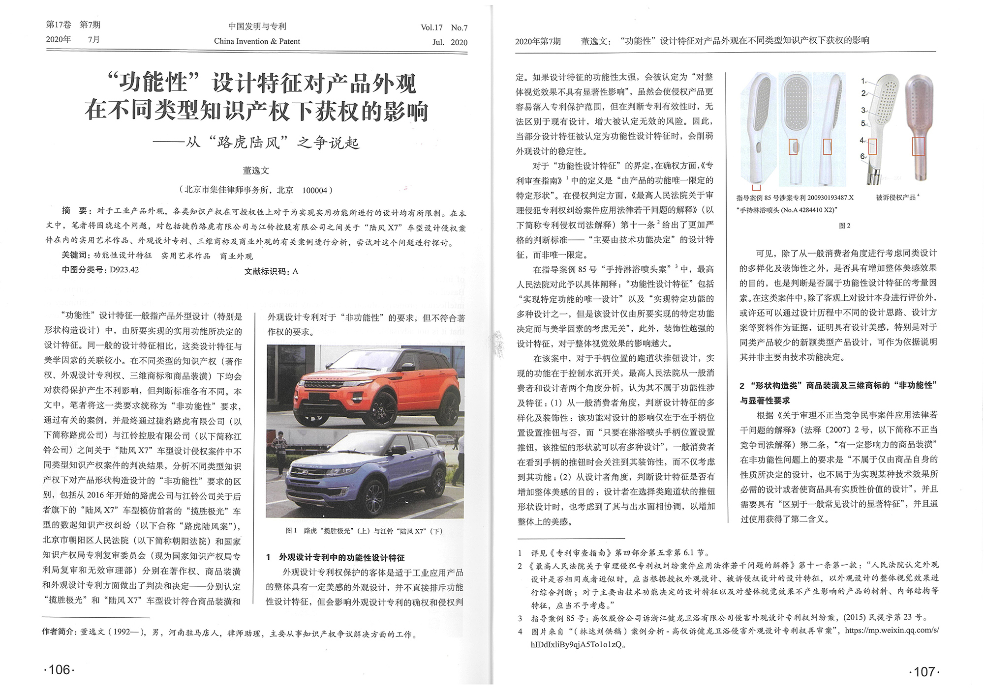 集佳文章《“功能性”設(shè)計特征對產(chǎn)品外觀在不同類型知識產(chǎn)權(quán)下獲權(quán)的影響——從“路虎陸風”之爭說起》在《中國發(fā)明與專利》發(fā)表