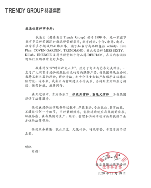 近日,集佳收到來自赫基集團(tuán)的表揚信,信中,客戶對集佳張亞洲律師、董逸文律師的辛勤付出表示感謝,為他們細(xì)致高效的專業(yè)服務(wù)、敬業(yè)正直的工作態(tài)度點贊!