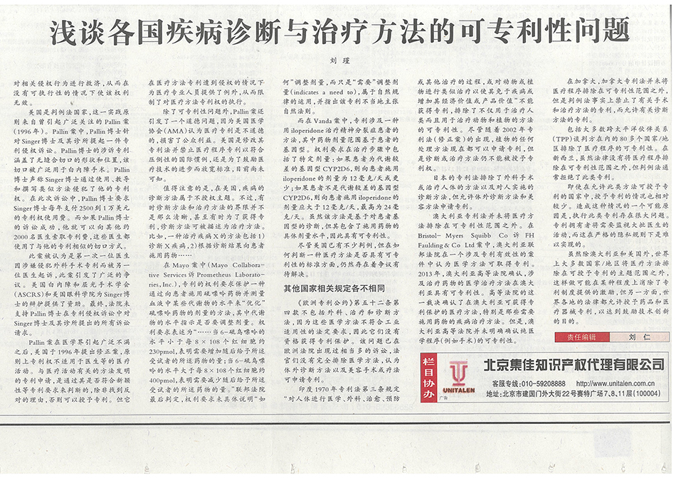 集佳文章《各國疾病診斷與治療方法的可專利性問題》在《中國知識產權報》發表