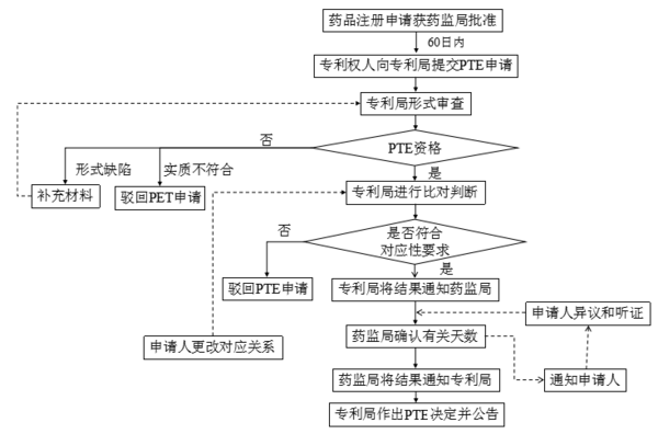 1)PTE申請人(專利權(quán)人)在收到藥監(jiān)局上市批準(zhǔn)的規(guī)定時限內(nèi)(例如60日)向?qū)@痔峤籔TE申請;
