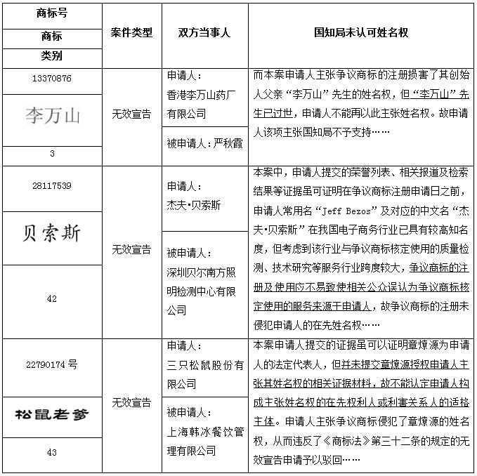 然而,在下述無效案件中,國知局并未對姓名權(quán)予以認可,請見如下表格: