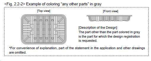 當(dāng)通過著色來區(qū)分保護部分和不保護部分時,同時在外觀設(shè)計說明中應(yīng)指出“除著色部分(如除灰色部分)以外的任何部分”是作為部分外觀設(shè)計請求進行保護的部分,如下圖10所示??梢钥闯觯@一點跟歐美的涂覆或者淡化處理是有所區(qū)別的,日本允許用不同的顏色加上語言說明來進行區(qū)分。