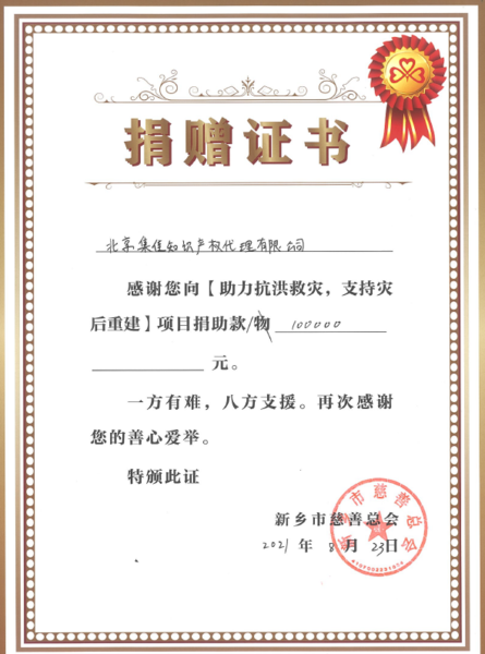 風雨無情人有情,一方有難,八方支援。災情發(fā)生后,集佳迅速響應號召,通過中共首都知識產(chǎn)權服務業(yè)協(xié)會委員會向河南受災地區(qū)捐贈10萬元,用于支援抗汛和災后重建工作。許多集佳員工也在第一時間獻出愛心,自發(fā)向災區(qū)捐款捐物,幫助受災群眾渡過難關,重建家園。