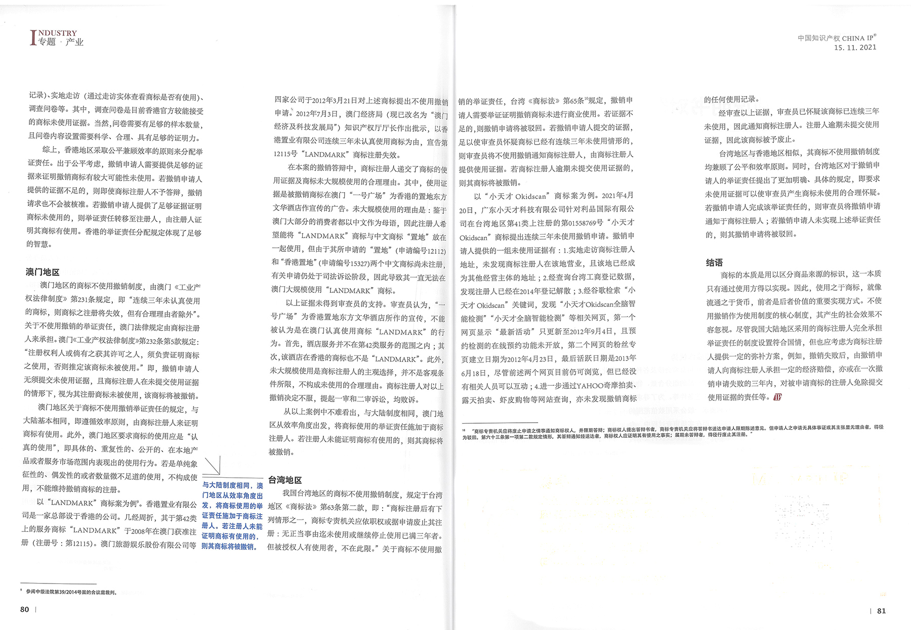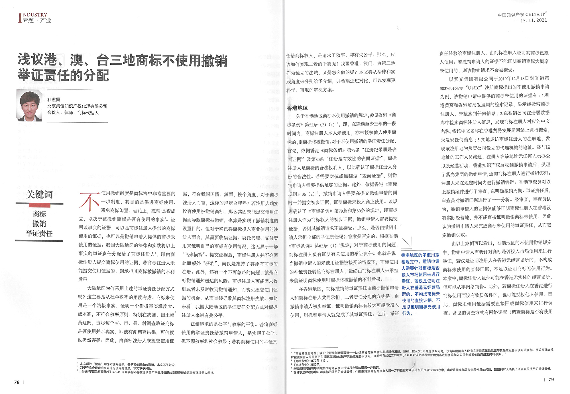 集佳文章《淺議港、澳、臺三地商標不使用撤銷舉證責任的分配》在《中國知識產權》發表