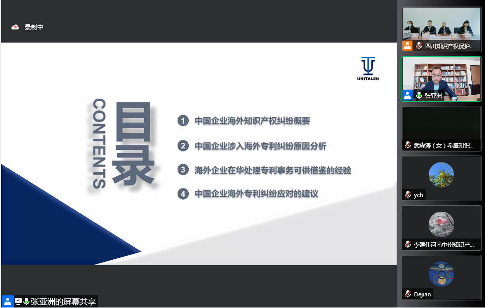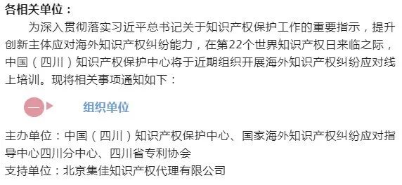 2022年4月20日,由中國(四川)知識(shí)產(chǎn)權(quán)保護(hù)中心、國家海外知識(shí)產(chǎn)權(quán)糾紛應(yīng)對(duì)指導(dǎo)中心四川分中心、四川省專利協(xié)會(huì)主辦,北京集佳知識(shí)產(chǎn)權(quán)代理有限公司協(xié)辦的“中國企業(yè)如何有效應(yīng)對(duì)海外專利糾紛”專題培訓(xùn)線上分享會(huì)成功舉辦。