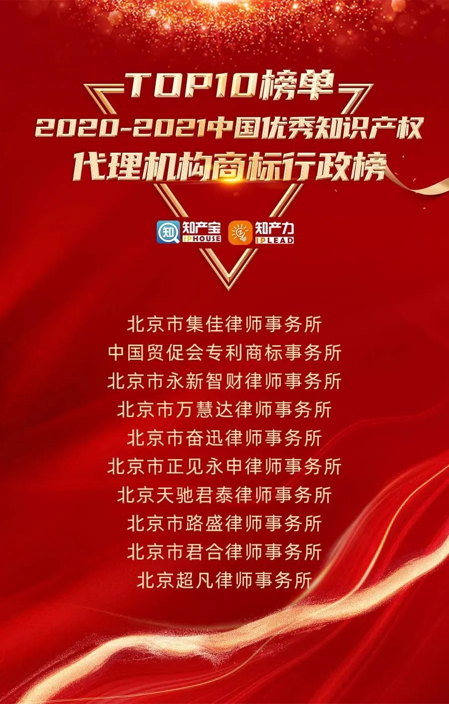 近日,備受業(yè)界關注的“2020-2021中國優(yōu)秀知識產(chǎn)權代理機構榜”正式揭曉,北京市集佳律師事務所憑借長期以來在知識產(chǎn)權領域的卓越業(yè)績和處理疑難案件的突出能力,從400余家知識產(chǎn)權代理機構中脫穎而出,榮登“中國優(yōu)秀知識產(chǎn)權代理機構商標行政榜TOP10”。