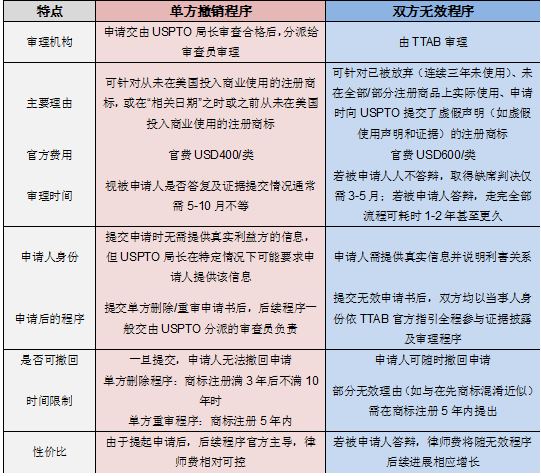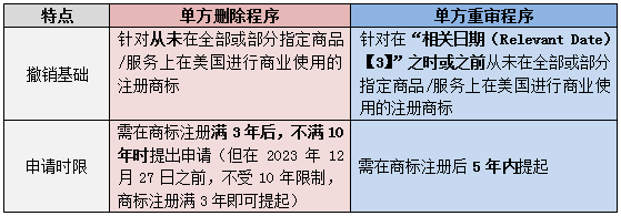 單方撤銷程序分為單方刪除程序和單方重審程序,根據美國《商標法》第16A、16B條及《審查指南》第1716條的規(guī)定,筆者將這兩項程序簡要對比如下表: