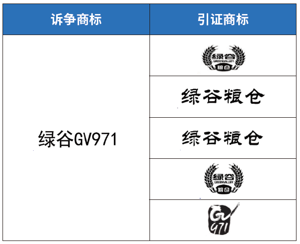 ”和引證商標1-4相比較,其中文部分僅為“綠谷”;即便其中還包含“GV971”,但是整體上沒有形成能夠和引證商標區分開的含義。訴爭商標和引證商標5相比較,“GV971”部分完全相同,即便其中還包含“綠谷”,但依然很容易被視為雙方存在特定關聯。