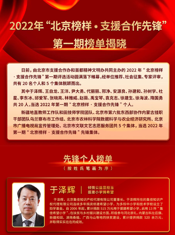 近日,由北京市支援合作辦公室和首都精神文明辦公室共同主辦的2022年“北京榜樣?支援合作先鋒”第一期評(píng)選活動(dòng)圓滿落下帷幕,經(jīng)單位推薦、社會(huì)征集、專(zhuān)家評(píng)審,共有20名個(gè)人和5個(gè)集體脫穎而出,集佳于澤輝所長(zhǎng)榮登“先鋒個(gè)人榜單”!