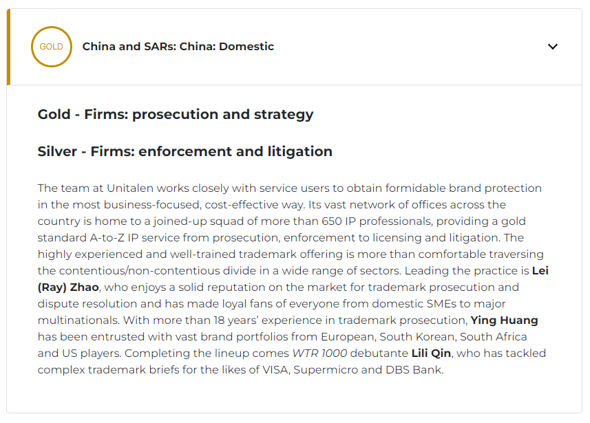WTR評價:“作為團隊的領軍人物,趙雷律師在商標申請和爭端解決方面享有卓著聲譽,在從國內中小企業到大型跨國公司中都擁有的忠實擁躉?!?/em>