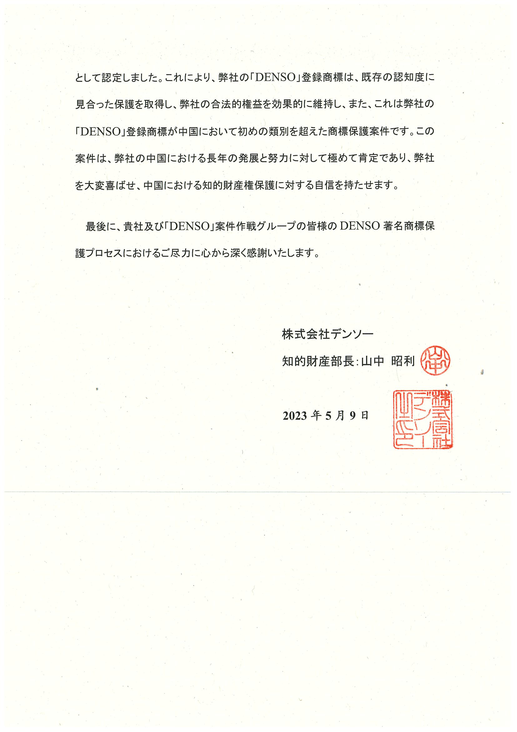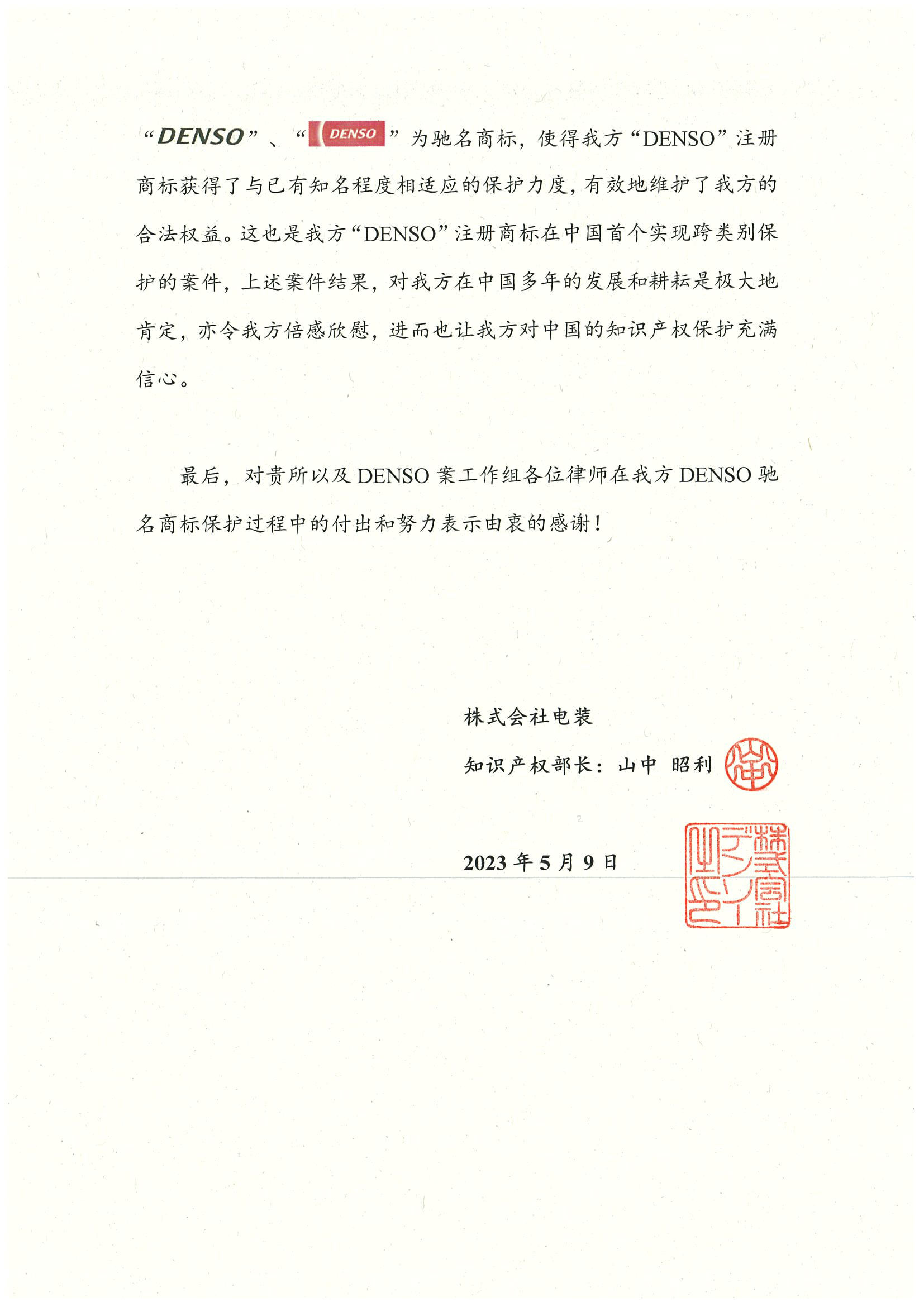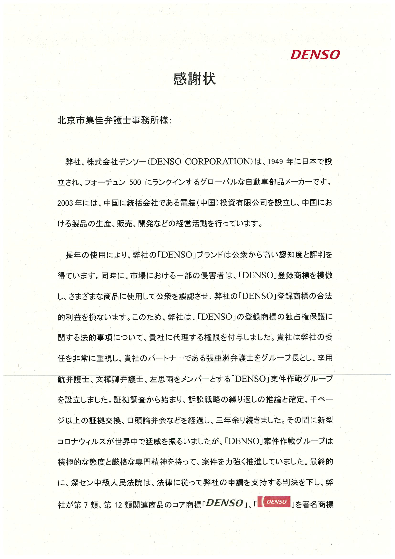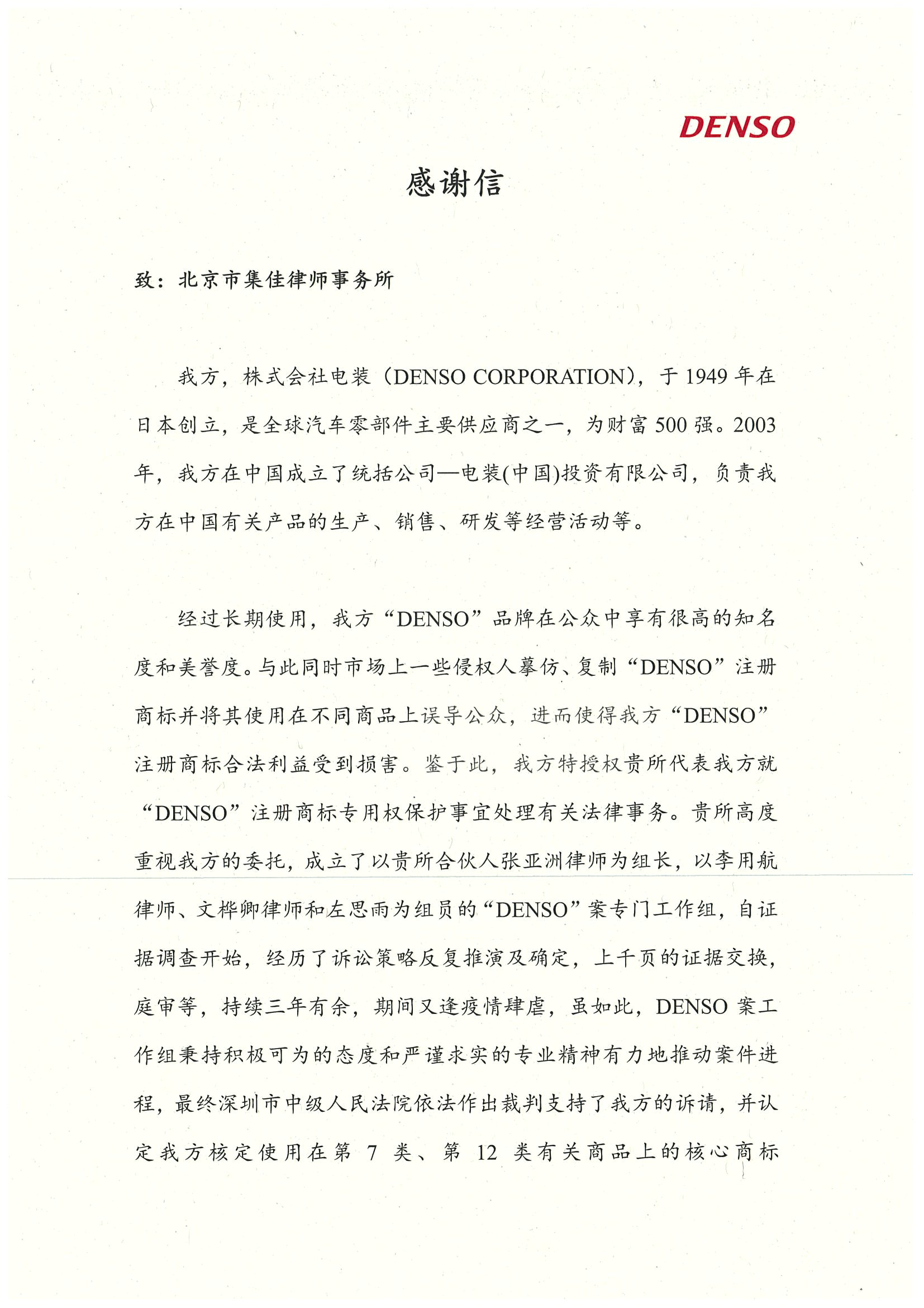 DENSO電裝專訪集佳 對集佳成功助力DENSO商標認馳、維護相關商標權致以衷心感謝