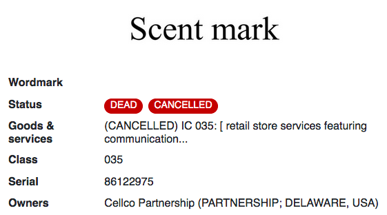 Verizon計(jì)劃將這種注冊(cè)商標(biāo)的香味推廣到其線下旗艦店。根據(jù)申請(qǐng)書(shū)的記載,此香味有助于將這些地點(diǎn)與“日益擁擠的其他通信和消費(fèi)電子產(chǎn)品零售商”區(qū)分開(kāi)來(lái)。該氣味商標(biāo)于2014年10月7日成為正式獲準(zhǔn)注冊(cè),該商標(biāo)目前已經(jīng)失效。