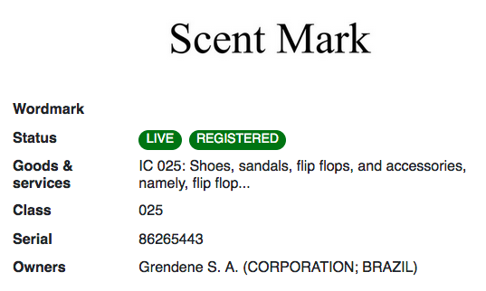 鞋類連鎖店 Flip Flop Shops 在線下店鋪中使用的椰子香味已獲得商標(biāo)注冊(cè)。注冊(cè)人申請(qǐng)時(shí)提交了大量新聞報(bào)道,聲稱這種香味是他們品牌的重要識(shí)別部分。其中一個(gè)例子寫(xiě)道,“從 15 英尺外走近,椰子防曬油的香味和充滿能量的音樂(lè)開(kāi)始刺激感官,讓潛在顧客興奮不已。”