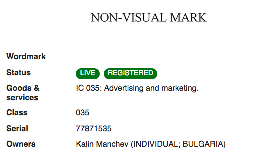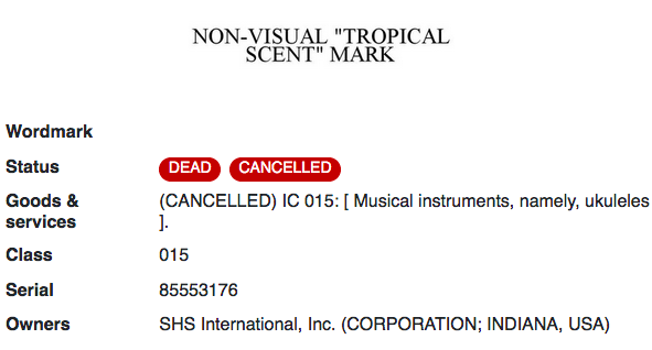 該公司將一種尤克里里琴型號(hào)所用的椰林飄香氣味成功申請(qǐng)為商標(biāo)。但在實(shí)際使用過(guò)程中卻面臨產(chǎn)品本身的問(wèn)題。運(yùn)往海外的尤克里里琴在運(yùn)輸過(guò)程中失去了氣味……所以當(dāng)海外客戶彈奏時(shí),它們聞起來(lái)就只是尤克里里琴的味道了。目前該商標(biāo)注冊(cè)已失效。