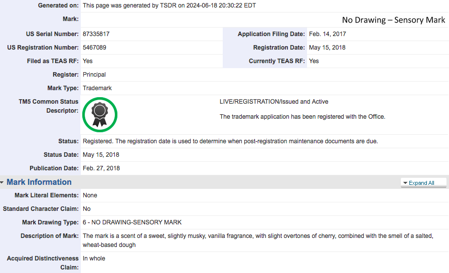 雖然美國(guó)允許將氣味申請(qǐng)為商標(biāo),但已經(jīng)獲得注冊(cè)的氣味商標(biāo)數(shù)量不多。第一件美國(guó)氣味商標(biāo)“雞蛋花香味的繡花線”(a plumeria blossom-scented embroidery thread)是在1990年獲準(zhǔn)注冊(cè)的。加利福尼亞公司OSEWEZ的氣味商標(biāo)經(jīng)過(guò)駁回復(fù)審后首次獲得注冊(cè)(該商標(biāo)已經(jīng)失效)。時(shí)至今日,美國(guó)僅有10件左右氣味商標(biāo)獲得注冊(cè),氣味商標(biāo)注冊(cè)的難度可見(jiàn)一斑。筆者列舉美國(guó)氣味商標(biāo)的注冊(cè)情況如下: