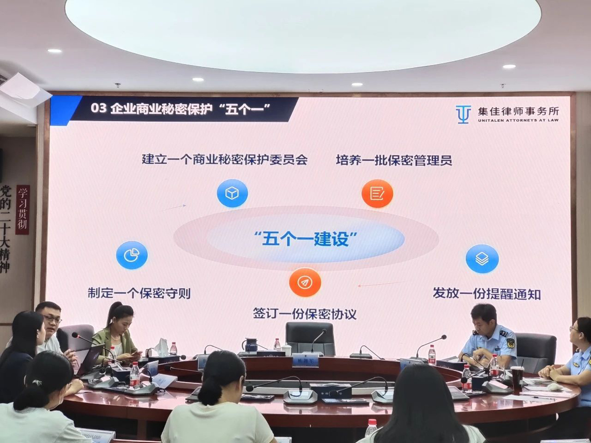 在系列培訓(xùn)活動上,吳恙律師介紹了商業(yè)秘密的基本概念及構(gòu)成要件,結(jié)合與專利制度的橫向?qū)Ρ确治錾虡I(yè)秘密制度的要點(diǎn)及特征。進(jìn)而引入商業(yè)秘密保護(hù)“五個(gè)一”建設(shè)的政策宣貫,包括建立一個(gè)商業(yè)秘密保護(hù)委員會、培養(yǎng)一批保密管理員、制定一個(gè)保密守則、簽訂一份保密協(xié)議、發(fā)放一份提醒通知。同時(shí),吳恙律師進(jìn)一步介紹了圍繞“五個(gè)一”政策的商業(yè)秘密保護(hù)體系建設(shè)方式,從企業(yè)宏觀預(yù)期及周期建設(shè)目標(biāo)管理、商業(yè)秘密盤點(diǎn)梳理分級制度、全生命周期流程管理、涉密崗位及員工入離職管理、涉密載體及信息系統(tǒng)管理、內(nèi)部培訓(xùn)及教育警示制度、風(fēng)險(xiǎn)事件應(yīng)急處置機(jī)制等方面逐步完善適合企業(yè)自身發(fā)展需求的商業(yè)秘密保護(hù)體系。