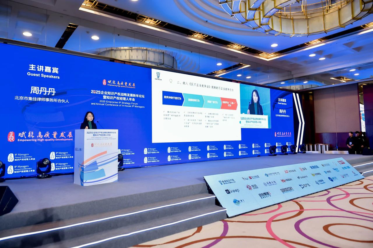 本次年會(huì)以“賦能高質(zhì)量發(fā)展”為主題,深入探討大數(shù)據(jù)、人工智能等前沿技術(shù)在企業(yè)知識(shí)產(chǎn)權(quán)領(lǐng)域的創(chuàng)新應(yīng)用。受主辦方邀約,集佳合伙人周丹丹律師為此次大會(huì)帶來主題演講,她圍繞 “《反不正當(dāng)競(jìng)爭(zhēng)法》修改對(duì)企業(yè)知識(shí)產(chǎn)權(quán)工作的影響”這一主題,詳細(xì)說明了此次《反不正當(dāng)競(jìng)爭(zhēng)法》(草案)的主要修訂核心內(nèi)容,分享了對(duì)《反不正當(dāng)競(jìng)爭(zhēng)法》修改趨向的思考,并結(jié)合近十年不正當(dāng)競(jìng)爭(zhēng)領(lǐng)域的典型案例和多年代理競(jìng)爭(zhēng)類案件的實(shí)戰(zhàn)經(jīng)驗(yàn)對(duì)企業(yè)提出一系列企業(yè)競(jìng)爭(zhēng)行為的合規(guī)建議,引發(fā)現(xiàn)場(chǎng)嘉賓與知識(shí)產(chǎn)權(quán)從業(yè)者的關(guān)注與探討。