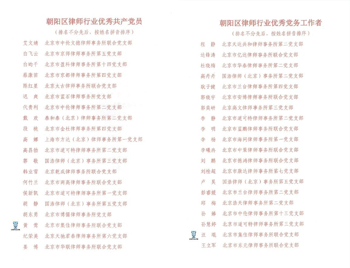 6月27日,朝陽(yáng)區(qū)律師行業(yè)黨委召開(kāi)了朝陽(yáng)區(qū)律師行業(yè)慶祝中國(guó)共產(chǎn)黨成立104周年暨總結(jié)表彰大會(huì),集佳律所聯(lián)合黨支部黨員黃鶯榮獲“朝陽(yáng)區(qū)律師行業(yè)優(yōu)秀共產(chǎn)黨員”稱號(hào),支部黨員汪琨榮獲“朝陽(yáng)區(qū)律師行業(yè)優(yōu)秀黨務(wù)工作者”稱號(hào)。