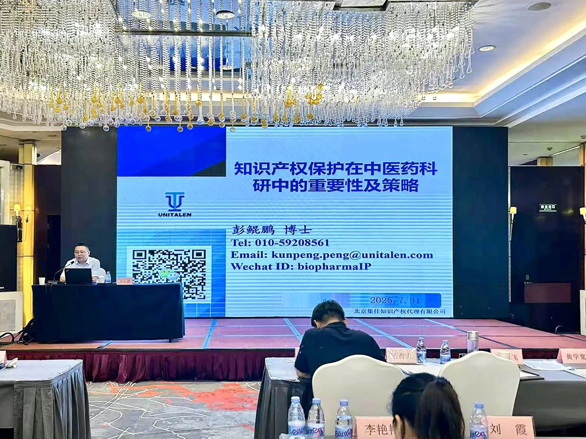 2025年7月31日,重慶市衛(wèi)生健康委員會主辦的 “2025年全市中醫(yī)藥科技創(chuàng)新能力提升培訓(xùn)班” 在重慶歐瑞大酒店舉行。集佳合伙人彭鯤鵬博士受邀主講 “知識產(chǎn)權(quán)保護在中醫(yī)藥科研中的重要性及策略”,為全市二級以上公立中醫(yī)醫(yī)療機構(gòu)分管領(lǐng)導(dǎo)、科研負(fù)責(zé)人及巴渝岐黃學(xué)者等帶來專業(yè)解讀,助力中醫(yī)藥科研成果轉(zhuǎn)化與權(quán)益保護。